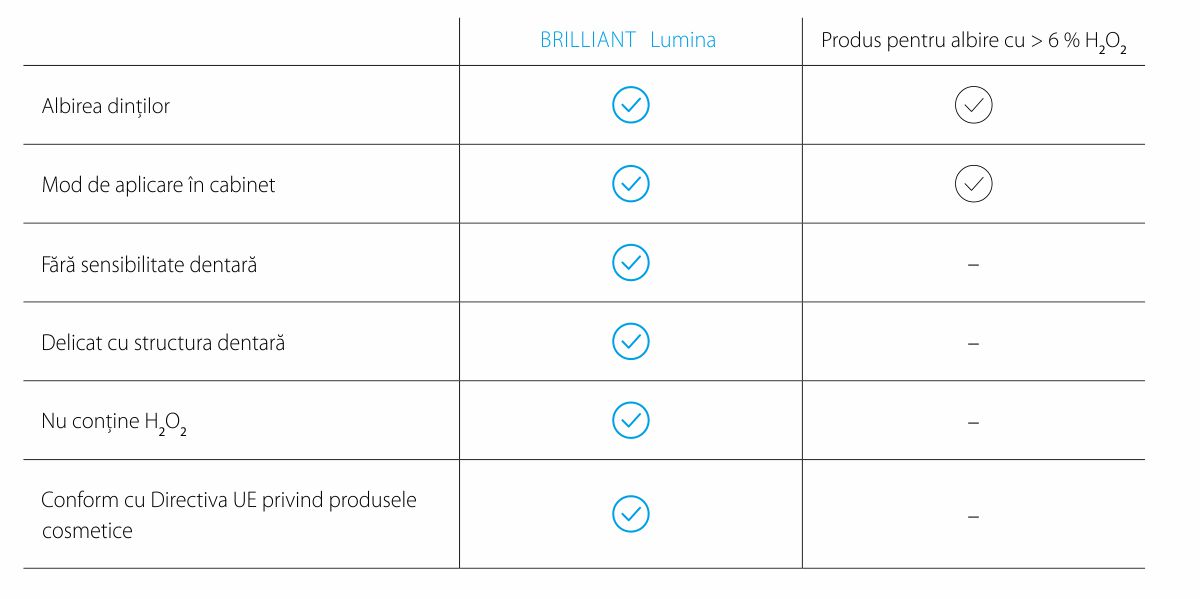 Les avantages de BRILLIANT Lumina par rapport aux produits contenant > 6 % de H2O2 sont les suivants :